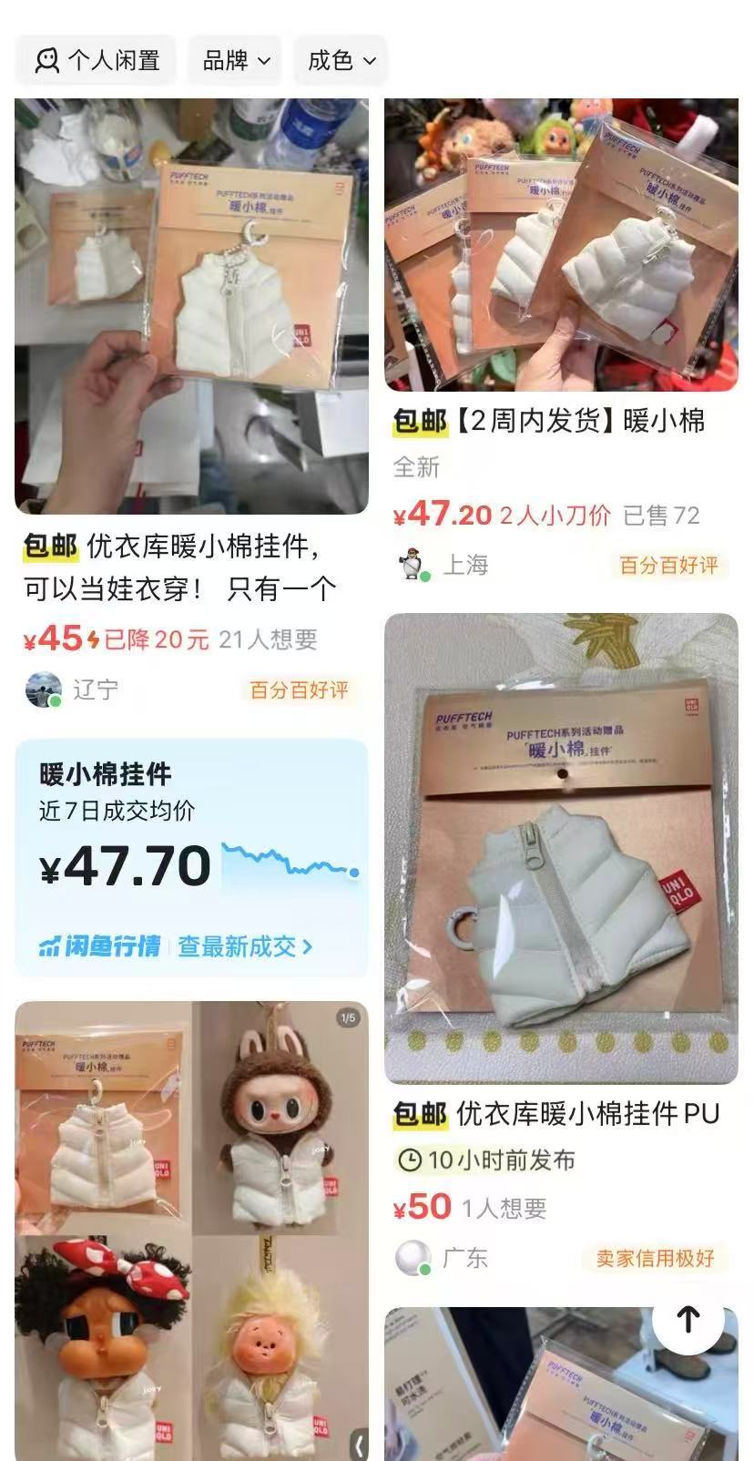 近期,优衣库为推论PUFFTECH气氛棉服系列,推出了限量赠品“暖小棉”挂件,其可DIY为背包挂饰、适配Labubu等潮玩,热度一连刷屏社交平台,二手平台还被炒至几十元出售,成为岁晚衣饰营销范畴的“流量黑马”。